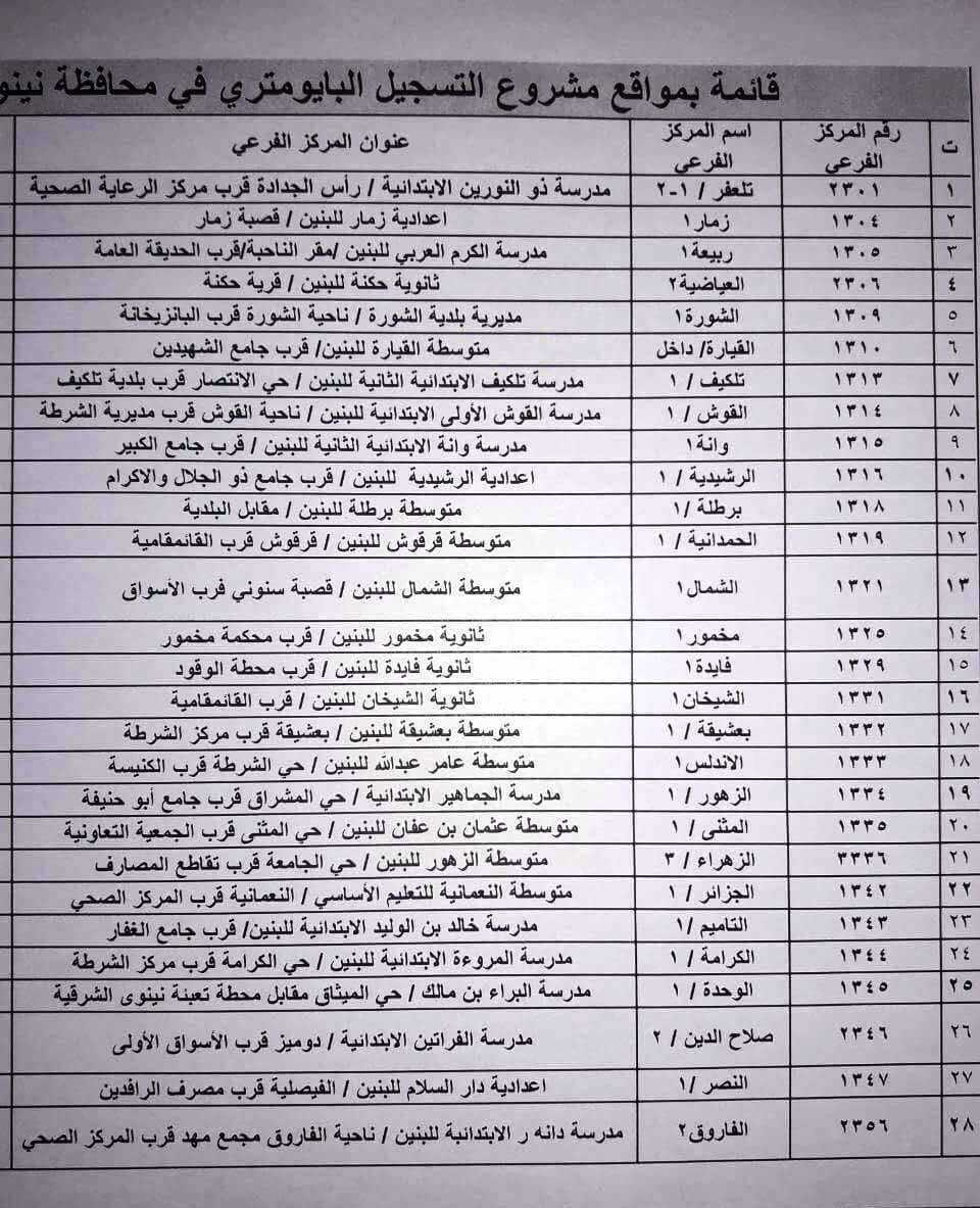 ودعا المكتب في بيانه ابناء شعبنا في محافظة نينوى الى القيام بعملية التسجيل عبر المراكز المخصصة لها في المحافظة ليتسنى لهم الادلاء باصواتهم والمشاركة في العملية الانتخابية المقبلة، علما ان الجدول المرفق يضم اسماء ومواقع المراكز التي تقوم بعملية التسجيل .