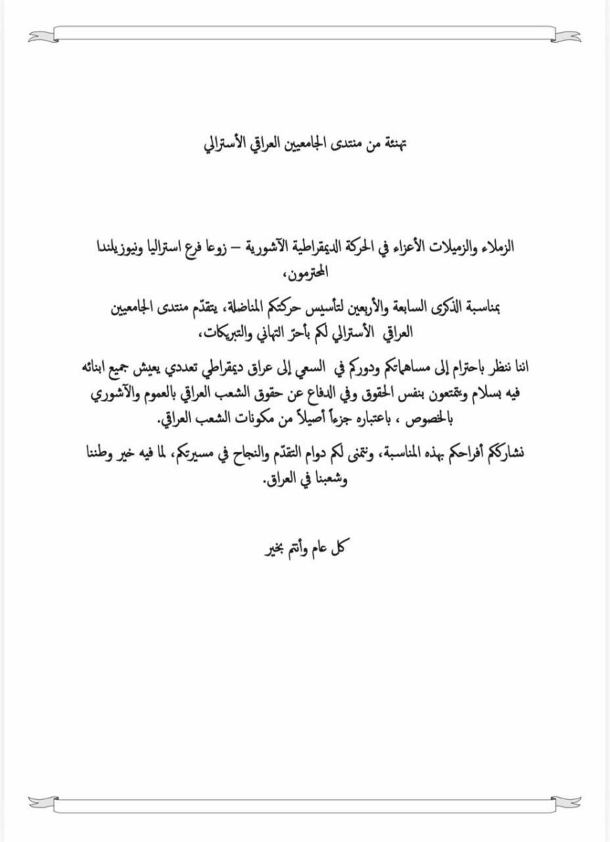 تلقى فرع أستراليا ونيوزيلندا لحركتنا الديمقراطية الآشورية – زوعا برقية تهنئة من منتدى الجامعيين العراقي الأسترالي، بمناسبة الذكرى السابعة والأربعين لتأسيس الحركة، عبّر فيها المنتدى عن تهانيه وتبريكاته بهذه المناسبة، مشيدا بدور حركتنا ومسيرتها في الدفاع عن الحقوق والسعي من أجل عراق ديمقراطي تعددي يصون كرامة جميع أبنائه، ويكفل حقوق شعبنا بوصفه مكونا أصيلا من مكونات الشعب العراقي.