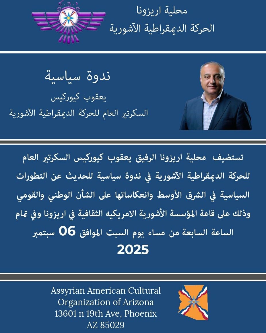 Home /اخبار الحركة/المكتب السياسي/ندوة سياسية للرفيق يعقوب... ندوة سياسية للرفيق يعقوب كوركيس السكرتير العام للحركة الديمقراطية الآشورية في ولاية أريزونا الأميركية: Posted on 4 سبتمبر, 2025 by admin A