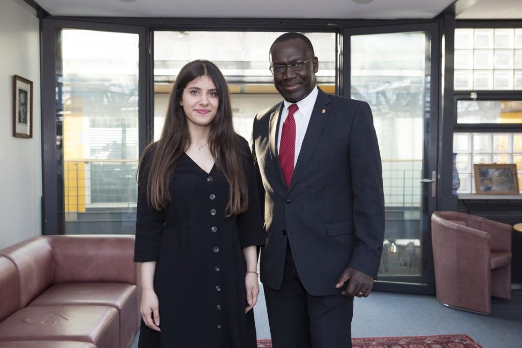 وقلت على حساب تويتر: بصفتي لاجئة عراقية، أعرف جيداً مايعني الهروب، ولا يتعين عليك أن تكون في منصب عالٍ للوقوف بثقة مع اللاجئين. شكراً لجورج أوكوث أوبو لعمله مساعداً خاصاً لي طوال هذا اليوم لتولي الفتيات المناصب ضمن البرنامج العالمي لدعم اللاجئين.