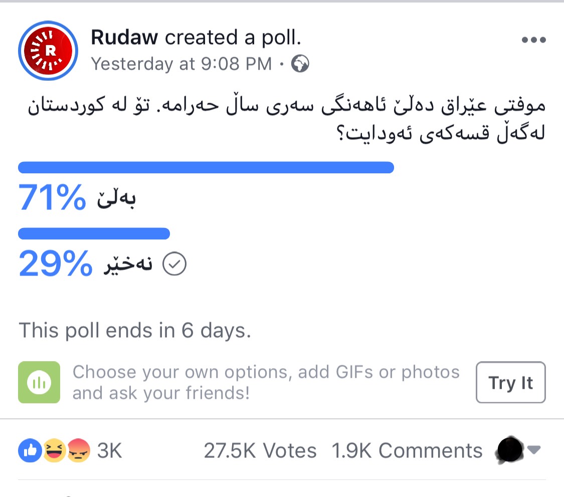 اجرت شبكة روداو الاعلامية استفتاءا باللغة الكردية لمتابعيها في اقليم كردستان العراق عن فتوى مهدي الصميدعي التي اكد فيها عدم جواز التهنئة برأس السنة وحرم معايدة المسيحيين.